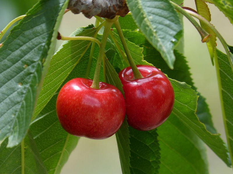 树势中庸偏旺,树姿半开张。主干灰白色,皮孔椭圆形,明显。一年生枝浅褐色,二年生枝灰褐色。叶片大,浓绿色,倒卵圆形,平展,粗重锯齿;叶基楔形;成熟叶片顶端骤尖;蜜腺小,肾形。具有良好的早果性,苗木定植当年萌发的发育枝基部易形成腋花芽,幼树腋花芽结果比例高。成年树以短果枝和花束状果枝结果为主。自花不实,可以用美早、早生凡、萨米脱、红灯、桑提娜作为授粉树。